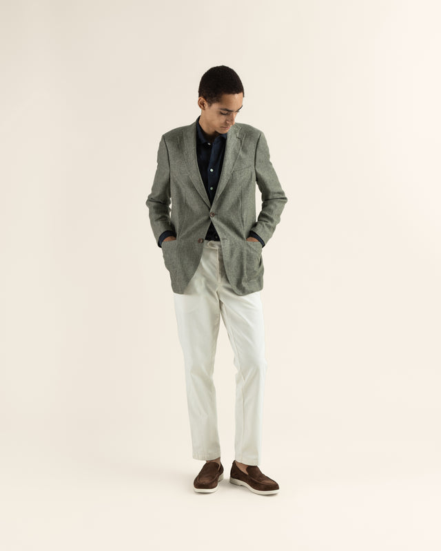 Monikäyttöinen irtotakki laadukkaalla pellavasekoite-kankaalla. Rentoutta takkiin tuo paikkataskujen lisäksi puolivuoritus. Kankaan kesäisen vihreän sävyn ansiosta takki on helppo yhdistää esimerkiksi monien farkkujen tai chinojen kanssa.